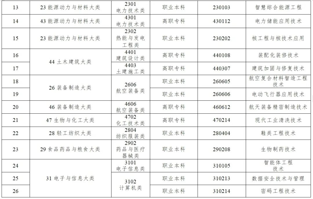 12月12日,教育部更新发布了《职业教育专业目录》,共增设40个新专业,其中,中职专业3个、高职专科专业20个、职业本科专业17个,增设数量是自2021年新版《职业教育专业目录》发布以来最多的一年。